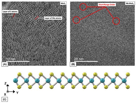 TEM images of the (A) pure MoS2 layer, (B) Nb:MoS2 film, and (C) scheme of the crystal structure of a MoS2 monolayer showing a layer of molybdenum (blue) sandwiched between two layers of sulfur (yellow).