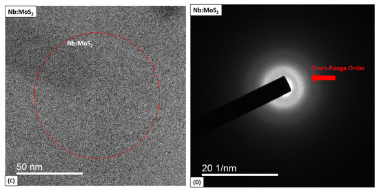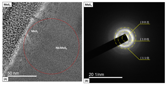 Figure 8A,C presents the regions where the SAED patterns were acquired for the MoS2 and Nb:MoS2 layers. The SAED patterns for the MoS2 and Nb:MoS2 films are shown in Figure 8B and Figure 8D, respectively. The SAED pattern for the pure MoS2 shows diffraction circles, related to the (100), (002), and (110) planes [6,47,48,49]. The (100) and (110) are related to the hexagonal structure of MoS2 and the (002) plane relates to the basal plane perpendicular to the substrate surface, regarding the Type II structure [49,50]. Despite the pure MoS2 layer being crystalline, the SAED pattern differs from that of a perfect crystal, with well-defined spots. This difference is due to the spot size used to perform this analysis, which is greater than the thickness of the pure MoS2 layer. On the other hand, the SAED pattern of the Nb:MoS2 film corresponds to an amorphous film containing a few nanosized short-range order (SRO) regions, corroborating the images presented before.