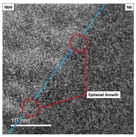 Figure 9 shows the transition between the Nb interlayer and the NbN layer, where it is possible to observe regions of epitaxial growth of NbN crystal columns from the partially amorphous Nb interlayer.