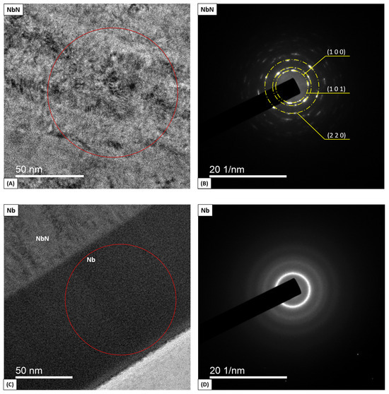 TEM images of the (A) NbN and (B) Nb layers. Red circles indicate regions for SAED analysis, with corresponding patterns in (C) and (D), respectively.