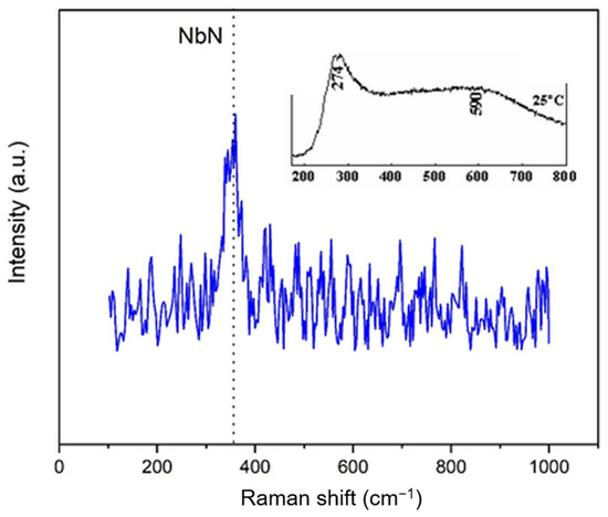 Figure 11 shows a Raman spectrum acquired on the NbN300 layer. One can see a slight shift to the right for the niobium nitride peak with respect to the standard position. Barshilia et al. [58] found that heating NbN in air promotes this displacement. This behavior may be attributed to oxidation since, as seen in Figure 5, oxygen contamination from the target was noticed in the niobium nitride layer.