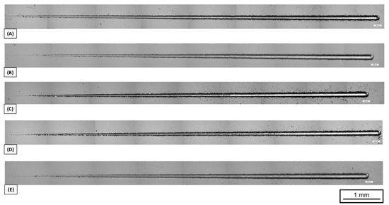 Scratch images of samples (A) Nb25, (B) Nb30, (C) Nb35, (D) Nb40, and (E) Nb25NbN300.