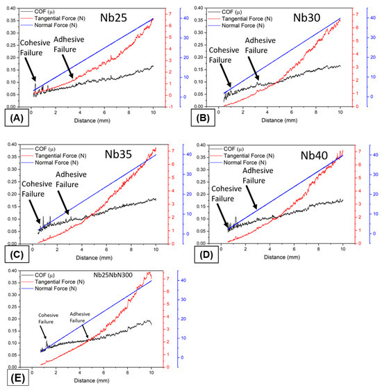 Graphs of COF, tangential force, and normal force as a function of the distance of the scratch for the samples (A) Nb25, (B) Nb30, (C) Nb35, (D) Nb40, and (E) Nb25NbN300.