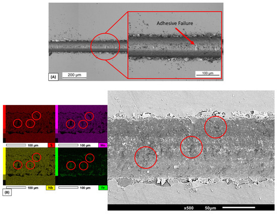 The absence of coating material has characterized the adhesive failures of the coating occurring at specific regions, as related to increased scattering in the coefficient of friction graph, which are observed in Figure 15 by the SEM and EDS characterization. In the optical microscope, it is possible to observe some regions with different gray shades, as seen in Figure 15A, which could correspond to regions with increased scattering on the graph. In Figure 15B, the EDS analyses confirmed that the coating was removed in these regions.