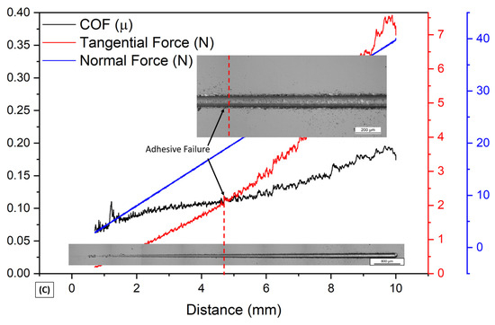 Figure 15C shows that immediately after the beginning of the serrated behavior of the COF graph, the number of regions (white spots) where the coating was removed increased, indicating the film’s adhesive failure [60,61].