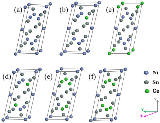 The crystal is classified within the monoclinic system, belonging to the space group C2/m [25]. Each unit cell comprises six nickel (Ni) atoms and eight tin (Sn) atoms. The Ni atoms occupy two distinct positions: Ni(2a) and Ni(4i). The Ni(2a) atoms are located at the eight vertices of a hexahedron and at the center of the XY plane, while the Ni(4i) atoms reside within the hexahedron and the XZ plane. The initial lattice parameters for the geometric optimization of the structure are as follows: a0 = 12.21 Å, b0 = 4.05 Å, c0 = 5.20 Å, β = 105.03°, and the volume V = 248.434 Å3. A schematic diagram of the crystal structure is presented in Figure 1a. Ce atom doping can substitute Ni atoms at the Wyckoff positions in the crystal, as illustrated in Figure 1. The calculated formation enthalpies for at the 4i and 2a positions are −24.607 kJ/mol and −23.079 kJ/mol, respectively. This indicates a preference for Ce atoms to occupy the 4i position over the 2a position, as evidenced by the lower formation enthalpy of (4i). Therefore, it is assumed in this calculation that all alloying elements occupy the 4i position within the crystal.
