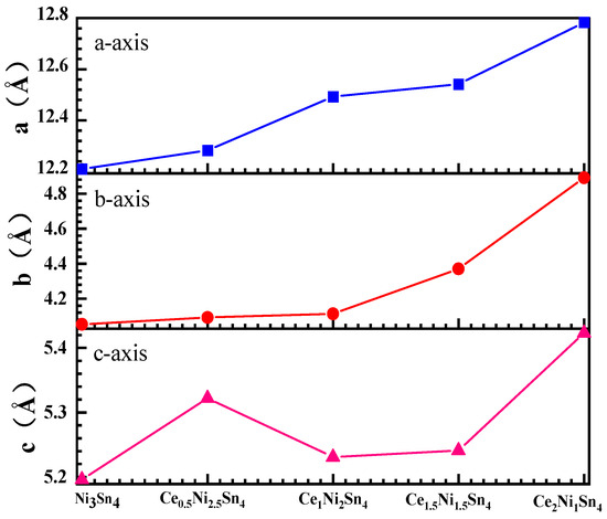 Figure 2 illustrates the variation in lattice constants of the alloy (x = 0, 0.5, 1, 1.5, 2). Atomic doping can significantly affect the lattice constants. Doping atoms typically either replace or insert themselves into the lattice of the matrix atoms. This alteration can lead to an increase or decrease in the lattice constant, depending on the size and properties of the doping atoms [30]. When the radius of the doping atoms is similar to that of the matrix atoms, the change in lattice constant is usually minimal. Conversely, when the radius of the doping atoms exceeds that of the matrix atoms, the lattice constant tends to increase; if the doping atoms are smaller, the lattice constant decreases. As the amount of Ce replacing Ni increases, the lengths of a (Å), b (Å), and c (Å) exhibit different increases compared to the lattice constant of Ni3Sn4, showing distinct directional differences. When the increments of the lattice constants a (Å), b (Å), and c (Å) differ, the crystal typically exhibits noticeable anisotropy in various directions [31,32]. This may weaken the directional dependence of bonding and consequently impact the anisotropic and elastic properties of (x = 0, 0.5, 1, 1.5, 2), which will be discussed later.