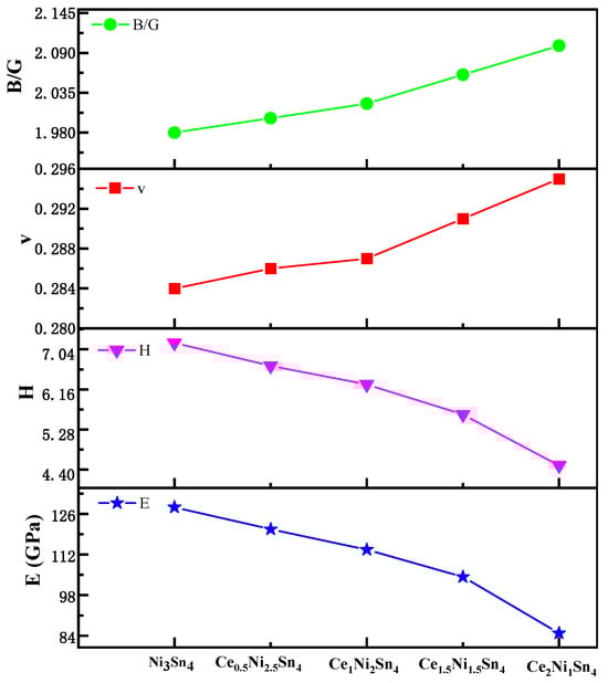 In general, the ratio of bulk modulus to shear modulus (B/G) is used to describe the ductility or brittleness of a crystal structure [46]. A lower B/G value is associated with brittleness, while a higher B/G value indicates improved ductility. For the structure, the B/G ratio is 1.98. Following the addition of Ce, the B/G value increases with higher Ce content, suggesting an enhancement in ductility. Moreover, a lower Poisson’s ratio signifies that the material experiences less lateral deformation during tensile or compressive loading, making it more susceptible to brittle fracture rather than plastic deformation once a critical stress threshold is reached [50]. In contrast, a higher Poisson’s ratio indicates greater lateral deformation under similar loading conditions, reflecting improved deformability and greater plasticity. Thus, the Poisson’s ratio is directly related to the material’s ability to resist shear stress; a higher Poisson’s ratio corresponds to enhanced plasticity. Consequently, the observed increase in Poisson’s ratio with Ce doping suggests that the plasticity of is enhanced, which is consistent with the findings from the B/G analysis. This indicates that with Ce doping, the material is more likely to undergo plastic deformation rather than brittle fracture under applied stress. Furthermore, as Ce content increases, the hardness (H) value decreases accordingly.