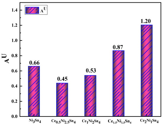 It is generally accepted that the evolution of cracks within solder joints is closely related to the elastic anisotropy of intermetallic compounds (IMCs). In electronic packaging, microcracks induced by elastic anisotropy can adversely affect the reliability of electronic products. During the production and operation of solder joints, the anisotropic plastic deformation of IMCs can lead to the formation of microcracks, thereby reducing the reliability of electronic devices [51]. To investigate the impact of Ce introduction on the elastic anisotropy of IMCs, a universal anisotropy index was employed. A higher value indicates greater structural anisotropy of the material. The calculation formula for is provided below, with the calculated results shown in Figure 4.