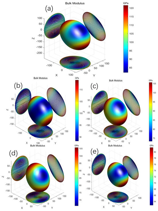 The surface constructions of bulk modulus for (a) , (b) , (c) , (d) , and (e) .