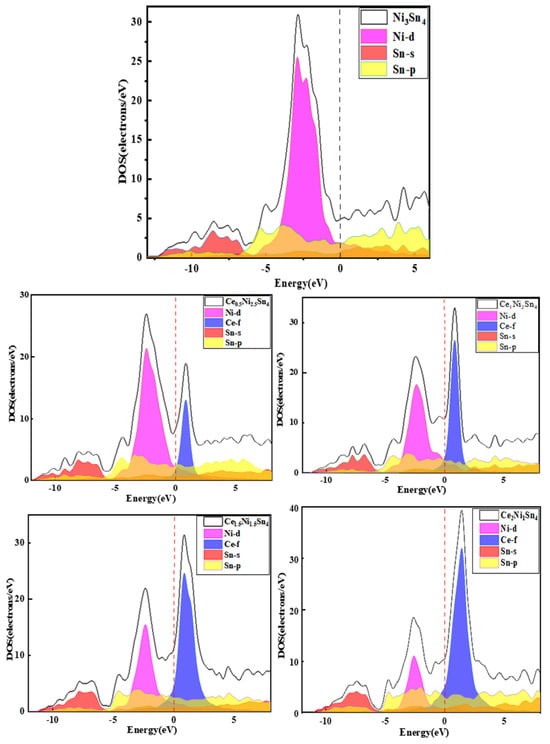 In metal compound , two primary bonding peaks are observed at −2.31 eV and −1.78 eV. The main factor influencing the bonding in is the hybridization between Ni-d and Sn-p states, with the DOS values contributed by Ni-d states spanning from 0 to −5.5 eV. Below −6 eV, the Sn-s states predominantly influence the DOS, consistent with previous findings [54]. In the Ce-doped intermetallic compound , these bonding peaks are weakened, and a new bonding peak appears around 0.8–1.4 eV, primarily dominated by Ce-f electrons. This indicates that the hybridization between Ni-d and Sn-p electrons is diminished after Ce replaces Ni in . The introduction of Ce also reveals a contribution from Ce-f states to the DOS and suggests that there may be covalent bonding between Ni and Ce.