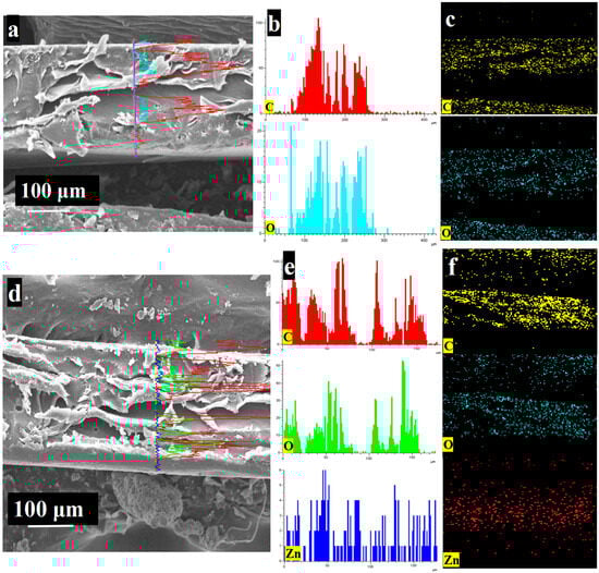 To validate the multi-layered shell structure, SEM was used to obtain a cross section of the composite paint, and the EDS line scan method was used to obtain a cross section, which is illustrated in Figure 2. In Figure 2a, the pure epoxy resin paint exhibits a classic type of brittle crack with a characteristic slot shape and a flat crack face. The EDS line scan (Figure 2b) and the mapping (Figure 2c) reveal that the carbon (C) and oxygen (O) components are evenly distributed in the coating, which means that there is no delamination in the EP coating. After applying a layer of ZnO–Gr, the coating showed an obvious delamination structure (Figure 2d), and the EDS line scan results also proved that the Zn elements were distributed in the coating (Figure 2e). Through EDS mapping analysis (Figure 2f), it is evident that the C element is uniformly distributed in the coating, which proves that with the addition of ZnO, the dispersing ability of the graphite powder is improved and the graphite powder is uniformly dispersed. When the ZnO–Gr addition was increased to two layers, the cross-sectional view revealed a distinct lamellar structure, with the lamination of the shell-like configuration being further intensified (Figure 2g). The results of the EDS line scanning of Zn also proved the separation between the bilayered ZnO–Gr coatings and epoxy coatings (Figure 2h), and the EDS mapping results further demonstrated the formation of the delamination structure and the role of ZnO in making the graphite powder uniformly dispersed in the coating (Figure 2i). When three layers of ZnO–Gr were coated, the cross section of the coating formed an obvious shell-like structure, and the emergence of the layered structure of one epoxy layer–ZnO–Gr coating can be seen very clearly (Figure 2j). The variations in the C, O, and Zn peaks observed in the EDS line-scanning results (Figure 2k) provide a clear indication of the coating’s layered structure. In the EDS mapping result (Figure 2l), the Zn element is obviously distributed in the three-layer structure, while the C element is uniformly distributed in all layers, which further proves that the formation of the shell-like structure and the incorporation of ZnO enhance the dispersing ability of the graphite powder, which in turn improves the corrosion resistance of the coating.