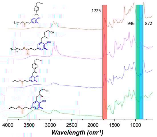 The polybenzoxazine network formation is confirmed by the typical band of the out-of-phase hydrogen wagging node for the 1,2,3,5-tetrasubstituted aromatic ring at 872 cm−1 (Figure 3) observed through FTIR. Additionally, the opening of benzoxazine cycles is certified by the disappearance of the characteristic peaks of benzoxazine at 934 and 1229 cm−1.