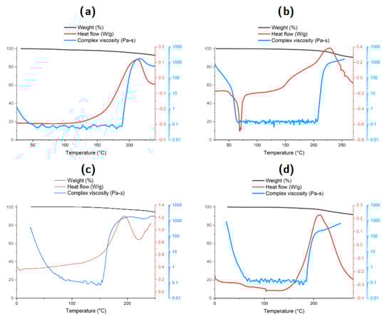 Thermal and rheological behavior of (a) PA-DD-mea, (b) PA-DD-Apa, (c) PA-EG-mea, and (d) PA-EG-Apa.