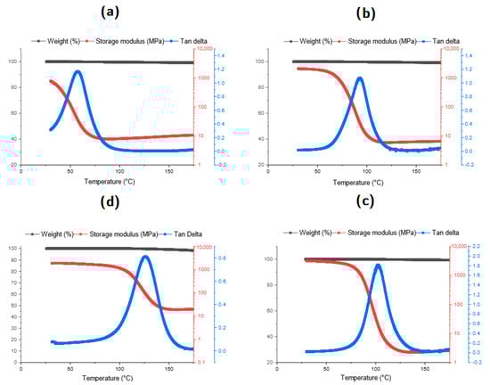 The dynamic mechanical analysis (DMA) was performed using a DMA Q800 TA Instruments analyser (TA Instruments, Zellik, Belgium). For neat matrices, DMA was carried out on rectangular samples (40/13/1 mm) in tensile mode with an amplitude of 2 μm at a frequency of 1 Hz, and a heating rate of 3 °C/min from 25 to 200 °C. The crosslinking density (ν′) was determined by applying Equation (3).