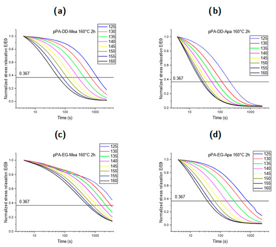 Thanks to the Maxwell model for viscoelastic fluids, which is typically employed in the context of covalent adaptive networks based on the transesterification mechanism, the characteristic relaxation time (T), defined as the time corresponding to 1/e of E(t)/E0, was obtained for each temperature and the activation energies were calculated following Arrhenius’ law (Table 4). For example, (T) at 150 °C, corresponding to the relaxation time at 150 °C, was 117, 32, 873 and 64 s for pPA-DD-mea, pPA-DD-Apa, pPA-EG-mea, and pPA-EG-Apa, respectively. The likely free volume provided by the aromatic amine allows fast transesterification reactions between the ester moieties and the free hydroxyl group carried by the primary amine [47]. Moreover, the low relaxation time obtained for all of the systems could be explained by the abundance of tertiary amine in the network, which may favor the nucleophilic substitution of the ester [38].