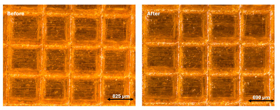 The cross-cut adhesion test was carried out according to the ISO 2409 standard [42]. The coatings were incised by three parallel knives to produce a grid. An adhesive tape elcometer ISO 2409 and ISO 8502-3 [43] was applied for 30 s on the coating and quickly removed. The aspect of the coating was further analysed by microscopy and compared with the standard class.