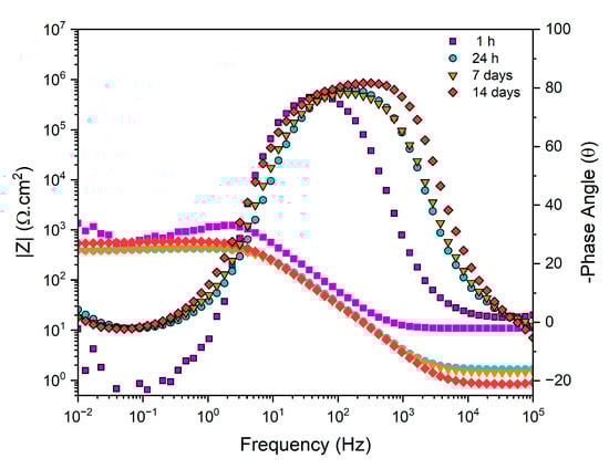 EIS measurements were performed in 0.1 M H2SO4 solution for acid resistance analysis of polybenzoxazine coatings. Figure 9 shows the Bode plots of blank Al substrates (without coating) after 14 days of immersion time. After 1 day, the impedance modulus at the low frequency of 0.01 Hz, as the representative of the whole system resistance [50], decreased from 1370 to 392 Ω·cm2. There is a capacitive loop at middle frequency, which is attributed to the charge-transfer process and interfacial reactions due to the oxidation of Al and reduction of water [51]. Moreover, the inductive loop at low frequency can be associated with the surface relaxation of intermediate species, as well as the adsorption of H+ and SO42− ions on the surface.