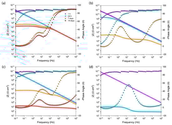 Bode plots of (a) pPA-DD-Apa, (b) pPA-DD-mea, (c) pPA-EG-Apa, and (d) pPA-EG-mea coated, after immersion in 0.1 M H2SO4 solution.