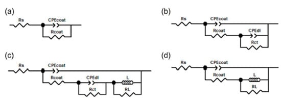 Electrical equivalent circuits (EEC) for fitting EIS data of (a) DD-Apa and EG-Apa coatings after 1 day immersion, (b) DD-Apa after 7 and 14 days and DD-mea after 1 day immersion, (c) DD-mea after 7 day immersion and EG-Apa after 7 and 14 days of immersion, (d) EG-mea after 1 day immersion, on Al substrates.