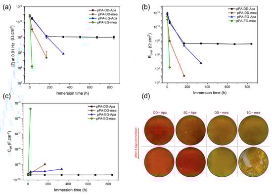 With passing time, Ceff of the coatings increases, which can be due to the absorption of electrolyte and an increase in the effective dielectric constant (ε), as the dielectric constant of water, present in the acid solution, is higher than polymers and there is a direct correlation between ε and Ceff (Equation (6)) [53]. The graphical representation of Ceff over immersion time is provided in Figure 12c. As can be seen, Ceff increased at a higher rate for samples with mea and, more specifically, EG-mea followed by EG-Apa and DD-Apa, respectively. These results align with the swelling ratio results of samples in H2SO4, which shows a higher swelling ratio for EG-mea and DD-mea (Table 2). Moreover, the hydrophobic and anti-protonation of APa-based coatings resulted in better acid resistance behavior. Diffusion of species in the coating and the swelling can promote electrolyte contact with the Al alloy substrate, leading to the loss of mechanical properties (physical degradation), as well as corrosion resistance (chemical and electrochemical degradation) [52].
