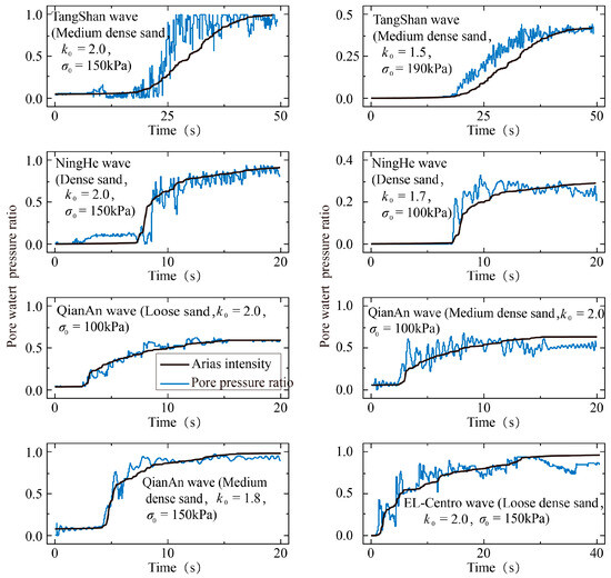 During the course of the study, the authors observed that the shape of the pore water pressure curve obtained from both physical and numerical cyclic triaxial tests under dynamic loading closely resembles the shape of the Ia curve of ground motion, as illustrated in Figure 1. In the cyclic triaxial tests, sand samples with varying relative densities were consolidated using different levels of consolidation pressure (σ0) and consolidation pressure ratios (k0). For specific sand parameters and test results, please refer to reference [15].