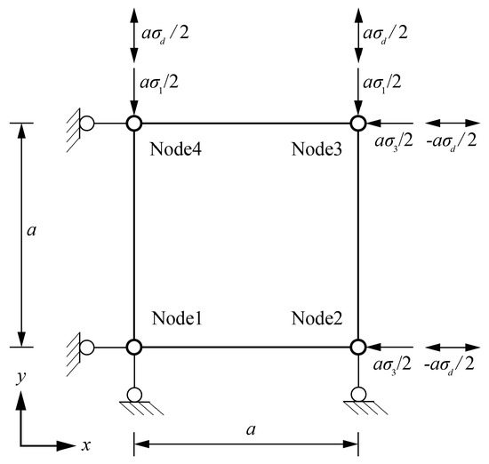 Step 1: Soil element consolidation. The boundary conditions for the numerical model were established in accordance with the physical test. The degrees of freedom for nodes 1 and 4 in the x-direction, as well as for nodes 1 and 2 in the y-direction, are constrained. Additionally, the degrees of freedom for nodes 2 and 3 in the x-direction have been coupled using a penalty function, ensuring that the displacements of nodes 2 and 3 in the x-direction are equivalent. A similar approach was applied to the degrees of freedom for nodes 3 and 4 in the y-direction. In this way, the concentrated load exerted on the soil nodes will be transmitted to the soil element as a uniform load. The degree of freedom concerning pore water pressure at all nodes remains unconstrained, and consolidation stress is applied to the model to simulate the drained consolidation of the soil unit. The consolidation pressure, denoted as −aσ3/2, is applied to nodes 2 and 3 in the x-direction. Concurrently, the consolidation pressure, −aσ1/2, is applied to nodes 3 and 4 in the y-direction. A static analysis is conducted to complete the consolidation process.