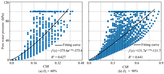 Figure 6 shows the relationship between the cyclic stress ratio (CSR) and pore water pressure in saturated Fujian standard soil subjected to earthquake ground motions. The relationship between the cyclic stress ratio (CSR) and pore water pressure was analyzed using data fitting software called CurveFitter, which possesses the capability to determine the optimal curve for a specified function along with its associated parameters. In this study, five potential functions—linear, quadratic, cubic, parabolic, and power functions—were evaluated for curve fitting. The function exhibiting the highest correlation coefficient (R2) was chosen to accurately represent the relationship between the CSR and pore water pressure. The curves presented in the subsequent text have all been generated utilizing this methodology; therefore, further elaboration is unnecessary. A power function relationship exists between the cyclic stress ratio and pore water pressure in saturated sand. The R2 for medium-dense sand (Dr = 60%) is 0.627, accompanied by a root mean square error of 16.7. In contrast, the R2 for medium-dense sand (Dr = 90%) is 0.641, with a root mean square error of 20.4. While a power function relationship between cyclic stress ratio and pore water pressure in saturated sand is observed, it is important to note that this relationship is not particularly strong.