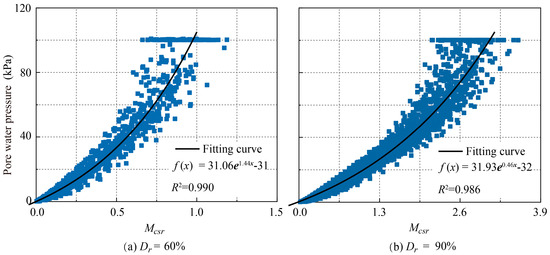 Figure 7 shows the relationship between the Mcsr and pore water pressure when the pore water pressure ratio ranges from 0.8 to 1.0. This finding suggests that Equations (8) and (10) are inadequate for accurately calculating pore water pressure as the sand approaches a liquefaction state. Consequently, it is essential to develop a new equation to ascertain whether the saturated sand has reached a liquefaction state.