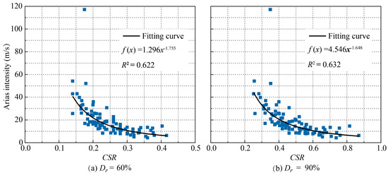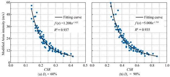 To establish more accurate liquefaction criteria, the mean period of ground motion is used to modify the Arias intensity. The modified Arias intensity, denoted as MIa, is defined by the equation MIa = (Ia,1.0g)d/(Tm)e, where d and e are parameters associated with the material properties of saturated sand. The relationships between MIa and the CSR required for liquefaction are shown in Figure 9 for saturated Fujian standard sand with different relative densities. The relationship between CSR and MIa was analyzed and fitted using MATLAB as the saturated sand approached the liquefaction threshold. For medium-dense Fujian standard sand (Dr = 60%), the correlation coefficient is the largest (R2 = 0.937), with d = 0.90 and e = 0.70. For dense Fujian standard sand (Dr = 90%), the correlation coefficient between the two variables is maximized at R2 = 0.935, with d = 0.91 and e = 0.71, as illustrated in Figure 9. The relationships between the MIa and the CSR required for liquefaction are represented by the following equations: