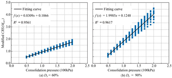 Relationship between the modified CRS (Mcsr) and consolidation pressure for (a) Dr = 60% and (b) Dr = 90%.