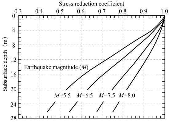 In this paper, the dynamic shear stress [24] at varying depths is calculated utilizing the shear stress reduction function in conjunction with the peak ground acceleration of the site (Equations (28) and (29)). To date, numerous models of the shear stress reduction function [25,26,27,28] have been proposed for different soil types. However, a limited number of shear stress reduction functions specifically designed for liquefaction sites exist. Based on the shear stress reduction function proposed by Golesorkhi et al. [24], Idriss et al. [25] developed a shear stress reduction function that is tailored to the unique characteristics of liquefied soil (Figure 13). In their study, Idriss et al. [25] emphasized that the shear stress reduction function is also influenced by both the depth of the soil and the magnitude of the earthquake. The relationship between the earthquake magnitude, depth, and the shear stress reduction function is articulated through Equations (30) and (31). The shear stress reduction function effectively accounts for the impacts of soil liquefaction, burial depth, and earthquake magnitude, thereby yielding more accurate predictive results.
