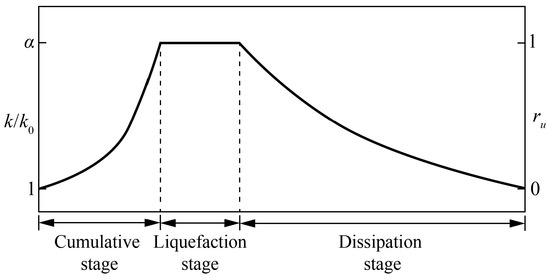 In the undrained triaxial test, the soil unit was in an undrained state; therefore, the influence of the permeability coefficient on the pore water pressure did not need to be considered. At the actual site, however, the soil unit is in a drained state, and the influence of the permeability coefficient must be considered when calculating the pore water pressure. Many researchers have found that the variable permeability coefficient can effectively improve the accuracy of numerical simulation compared to the fixed permeability coefficient [29,30,31]. For example, Shahir et al. [29] established the relationship between the permeability coefficient (k) and the excess pore water pressure ratio (ru) as shown in (Equation (35)). The accuracy of the numerical simulation for soil liquefaction was effectively improved by considering Equation (33). Therefore, the relationship between k and ru is widely used [32,33] in numerical simulations of soil liquefaction.