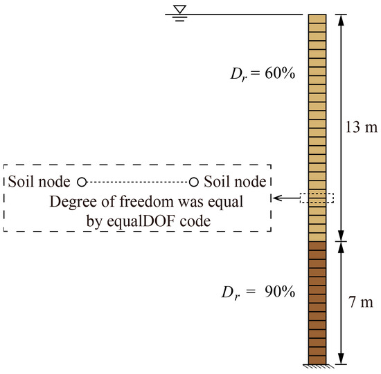 The bottom of the free-field model is fixed to facilitate the application of dynamic loads. Nodes of soil units that share the same horizontal elevation are constrained using a penalty function to establish periodic boundaries, thereby simulating an effectively infinite free field [21,22]. The top surface of the model is designed to be permeable, while the remaining boundaries are characterized as impermeable.
