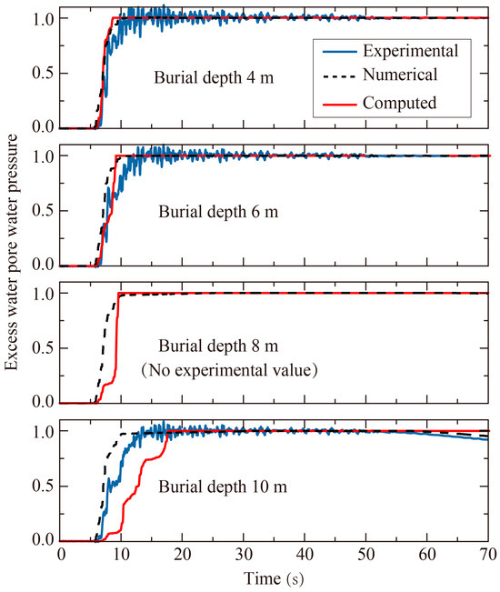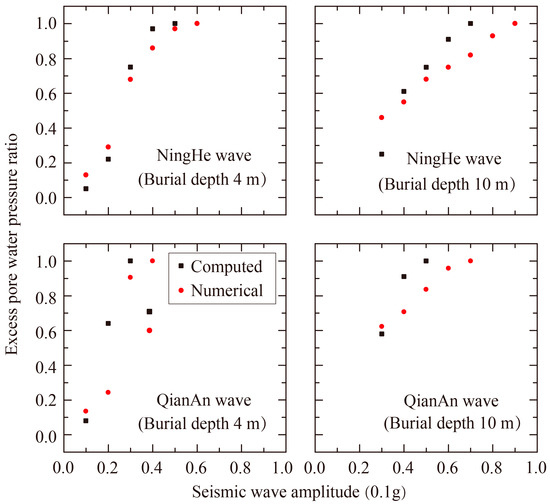 Figure 17 shows the comparison between the calculated and numerically simulated maximum excess pore water pressure ratios at burial depths of 4 m and 10 m, subjected to varying amplitudes of the Ninghe and Qian’an ground motions.