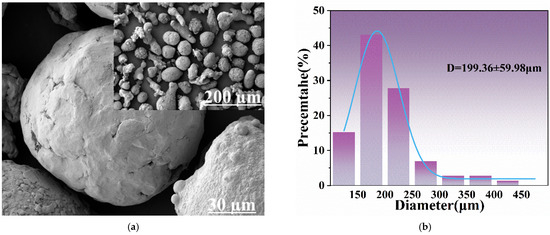 The experiment selected G10450 steel as the substrate material, with dimensions of 40 mm × 20 mm × 5 mm. The chemical composition of the substrate is shown in Table 1. The cladding powder consisted of elemental metal powders of Al, Fe, Co, Ni, Cr, and W with a purity of 99.99%, mixed in a molar ratio of 2:1:1:1:1:0.5. The particle size range of the powders was between 148 and 248 μm, as shown in Figure 1.