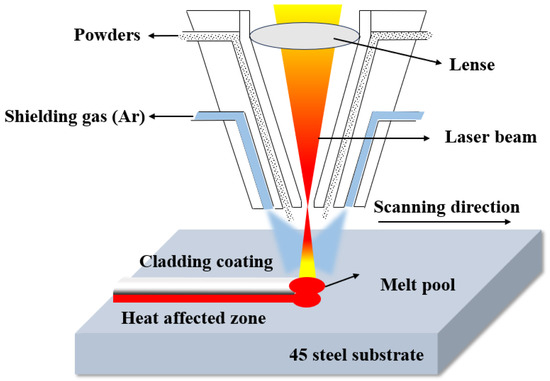 A planetary ball mill (QXQM-4L, Changsha, China) was used for powder preparation at a rotation speed of 180 r/min for 60 min. Si3N4 ceramic balls were used as grinding media, with a ball-to-powder mass ratio of 2:1. The mixed high-entropy alloy powder was air-dried for 24 h and then dried at 120 °C for 2 h before being stored in sealed bags for further use. The coating was processed using a laser cladding system (JSD-3000W, Shanghai, China) with a synchronous powder-feeding method. Argon gas was used as a protective atmosphere at a flow rate of 5 L/min. The laser cladding process parameters are listed in Table 2. A schematic diagram of the laser cladding process is shown in Figure 2.