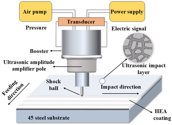 Ultrasonic impact treatment was performed on the Al2FeCoNiCrW0.5 high-entropy alloy samples using an ultrasonic impact device (HI-T002015A, Hightower, Handan, China). The specific parameters were as follows: input current of 0.2 A, impact head diameter of 8 mm, impact head stroke speed of 6 mm/s, impact amplitude of 30 μm, and impact frequency of 25 kHz. A schematic diagram of the ultrasonic impact process is shown in Figure 3.