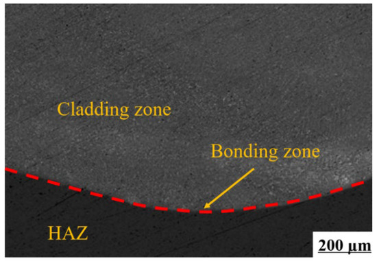 Figure 6 shows the SEM image of the cross-section of the laser-cladded Al₂FeCoNiCrW0.5 high-entropy alloy coating. As shown in Figure 6, the substrate is G10450 steel, and the fabricated high-entropy alloy coating exhibits a uniform microstructure without noticeable pores or cracks. The coating is metallurgically well bonded to the substrate. The thickness of the high-entropy alloy coating is 1.3 mm.