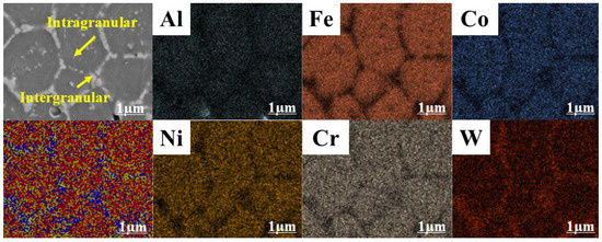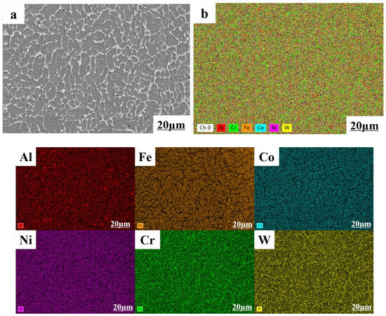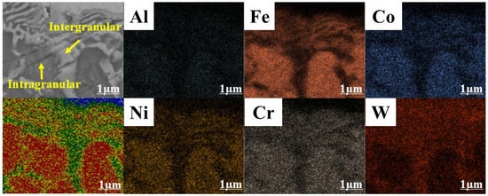 Figure 7 shows the microstructure and elemental energy dispersive spectroscopy (EDS) analysis of the top region of the Al2FeCoNiCrW0.5 high-entropy alloy coating. The analysis reveals that the top region of the coating primarily consists of Al, Fe, Co, Ni, Cr, and W elements. As shown in Figure 7b, Fe is concentrated at the grain boundaries, while no significant elemental segregation is observed within the grains, indicating a relatively uniform elemental distribution.
