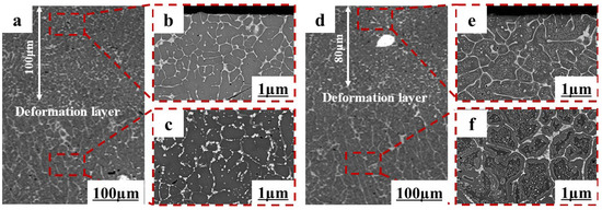 Figure 8 shows the cross-sectional microstructure of the UI and UI-R samples. As shown in Figure 8a,d, after ultrasonic impact treatment, a fine-grained layer with a significant gradient in size from the surface to the interior is formed, with a thickness of approximately 100 μm. The samples after recovery treatment exhibit a similar morphology, with the fine-grained layer thickness reduced to approximately 80 μm. Figure 8b shows the microstructure at the top of the UI sample coating. As indicated, after ultrasonic impact treatment, the grain size of the cladding layer gradually refines, forming a fine-grained layer. This is due to the strong plastic deformation induced by ultrasonic impact treatment at the surface, which promotes grain refinement [17,18,19]. As shown in Figure 8f, the particle size of the UI-R sample is slightly larger than that of the UI sample, which may be attributed to grain growth following recovery treatment. Figure 9 and Figure 10 show the energy dispersive spectroscopy (EDS) analysis of the middle layer of the UI and UI-R samples. As shown, the element distribution in the UI sample is uniform, with no obvious segregation or accumulation, which contributes to the stability of the coating’s performance. The distribution of major elements on the surface of the UI-R sample remains relatively uniform, with slight enrichment of tungsten (W) in some areas. This is attributed to the recovery treatment, which effectively reduces dislocation density, relieves residual stress, and allows W to diffuse slightly along the grain boundaries [20].
