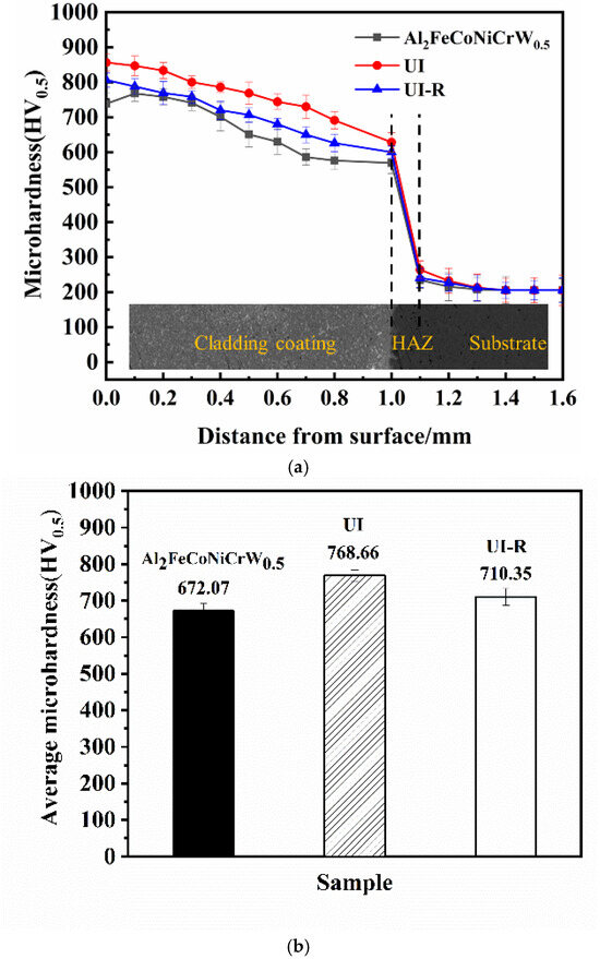 Figure 11 shows the microhardness profiles along the cross-section of the Al2FeCoNiCrW0.5 high-entropy alloy, UI sample, and UI-R sample. The results indicate that the hardness variation from the coating surface to the substrate can be divided into three stages: the coating, heat-affected zone (HAZ), and substrate, with the coating’s average hardness being 3–4 times that of the G10450 steel substrate. For the untreated coating, the maximum surface microhardness reached 738 HV0.5, showing a trend of increasing and then decreasing from the coating top to the substrate, stabilizing at the substrate. After ultrasonic impact treatment, the coating hardness increased significantly, with the maximum surface microhardness of the UI sample reaching 856 HV0.5. After recovery treatment at 300 °C, the surface microhardness of the UI-R sample decreased to 806 HV0.5.