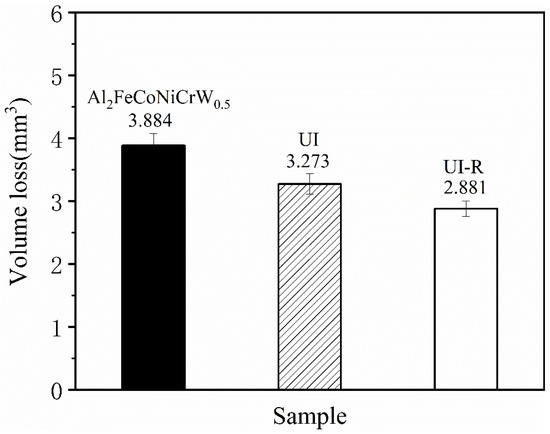 Volume loss caused by wear is a critical parameter for evaluating the wear resistance of metals. The wear volume loss of the Al2FeCoNiCrW0.5 high-entropy alloy, UI sample, and UI-R sample coatings is shown in Figure 13. As shown in the figure, the wear volume loss of the Al2FeCoNiCrW0.5 high-entropy alloy is greater than that of the UI and UI-R samples. According to the Hall–Petch relationship, the UI and UI-R samples exhibit higher wear resistance, which is attributed to grain refinement induced by ultrasonic impact. Additionally, the wear volume of the UI-R sample is lower than that of the UI sample. Although the hardness of the UI sample is slightly higher than that of the UI-R sample, the friction and wear performance of metallic materials depends not only on hardness but also on toughness. Appropriate recovery treatment can release the residual internal stress of the metal, resulting in improved toughness [23,24]. In this process, post-annealing transforms the dislocation cells in the impact layer into fine grains, leading to enhanced toughness and strength [25,26,27]. The results indicate that the Al2FeCoNiCrW0.5 high-entropy alloy coating, after ultrasonic impact treatment, exhibited improved wear resistance due to enhanced mechanical properties. Subsequent post-annealing further enhanced its wear resistance [28,29].