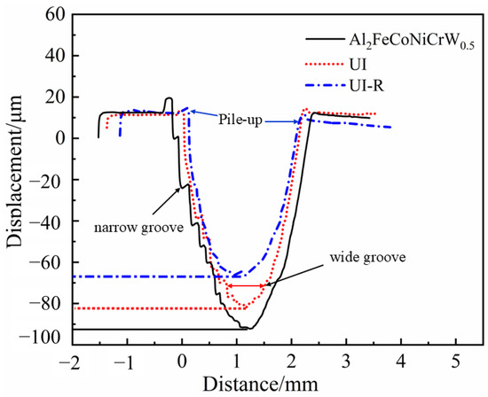 The cross-sectional profiles of wear scars for different samples are shown in Figure 14. The results indicate that the Al2FeCoNiCrW0.5 high-entropy alloy sample exhibits significant wrinkling, whereas the wear scar profiles of the UI and UI-R samples, after ultrasonic impact and recovery treatments, are smoother. For all samples, the maximum depth of the wear scar is located near the center of the scar, and the depth gradually decreases with increasing distance from the center. The maximum wear scar depths for the Al2FeCoNiCrW0.5 high-entropy alloy, UI, and UI-R samples are 92 μm, 82 μm, and 68 μm, respectively. Thus, the UI-R sample exhibits the smallest maximum wear scar depth, indicating superior wear resistance compared to the other samples.