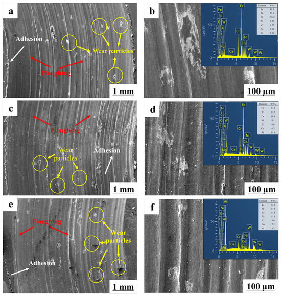 Wear morphology of coatings for different samples: (a) Al₂FeCoNiCrW₀.₅ sample, (b) Wear morphology of the Al₂FeCoNiCrW₀.₅ sample at higher magnification and EDS analysis of the wear surface, (c) UI sample, (d) Wear morphology of the UI sample at higher magnification and EDS analysis of the wear surface, (e) UI-R sample, (f) Wear morphology of the UI-R sample at higher magnification and EDS analysis of the wear surface.