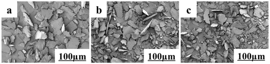 The wear debris morphology of different samples after wear testing is shown in Figure 16. The wear debris primarily consists of flaky spallation and granular particles. During the wear process, plastic deformation causes the coating to harden and lose ductility, making the material more prone to spalling. Large debris fragments are compressed and crushed under shear forces, forming smaller debris particles. As wear progresses, accumulated debris between contact surfaces creates grooves, resulting in abrasive wear [33]. As shown in Figure 16a, the wear debris of the Al2FeCoNiCrW0.5 sample is relatively large and flaky, indicating significant spalling on the wear surface. In the high-entropy alloy, the BCC phase, characterized by high hardness but lower toughness, bears most of the load and develops cracks and debris, while the FCC phase, with better toughness, deforms under wear, producing plowing wrinkles. The wear debris of the UI and UI-R samples is smaller than that of the untreated sample. However, the UI sample produces larger debris and experiences more severe wear compared to the UI-R sample. Due to work hardening induced by ultrasonic impact treatment, the UI sample exhibits lower toughness, making it more prone to crack propagation, which leads to flaky debris separating from the sample surface under plowing forces. In contrast, the UI-R sample, after ultrasonic impact and recovery treatment, maintains high hardness while also exhibiting improved toughness [34]. This results in smaller debris and better wear resistance, consistent with the wear mechanism and friction coefficient analyses.