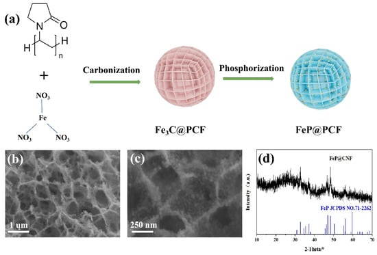 (a) Scheme of the synthesis process of the FeP@PCF composites. (b,c) SEM image of the FeP@PCF composites. (d) XRD patterns of the FeP@PCF composites.