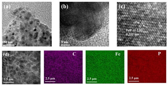 TEM (a–c), FeP@PCF, HRTEM, and (d) EDS elemental mappings of the FeP@PCF composites.