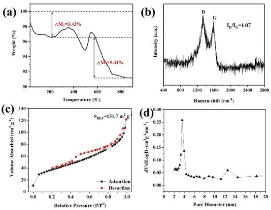 (a) Thermogravimetric curve, (b) Raman spectra, (c) N2 adsorption–desorption isotherms, and (d) pore size distribution curves of FeP@PCF.