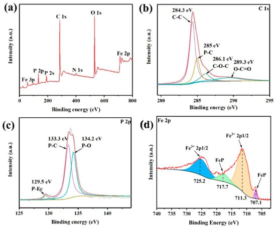 Figure 4 shows the investigation of the valence states of the elements in FeP@PCF using XPS. The full spectrum of FeP@PCF (Figure 4a) confirms the presence of C, P, O, and Fe atoms. As shown in Figure 4b, the high-resolution C 1s spectrum is divided into four peaks, corresponding to C-C (284.3 eV), P-C (285 eV), C-O-C (286.1 eV), and O-C=O (289.3 eV) bonds [27,28,29]. In the high-resolution P 2p spectrum (Figure 4c), a P-Fe peak is observed at 129.5 eV, while the P-O peak at 134.0 eV is attributed to the surface oxidation of FeP@PCF as a result of exposure to air [14]. The presence of the P-C peak at 129.5 eV, which is also observed at 285 eV in the C 1s spectrum, means that the bound FeP nanoparticles are securely attached to the porous nanocarbon framework through a chemical linkage. This strong interaction between the porous nanocarbon framework and the FeP nanoparticles helps prevent the nanoparticles from dissolving into the electrolyte [30]. In addition, the Fe 2p spectrum (Figure 4d) shows three peaks associated with Fe-P bonds—(707.1 eV), Fe3+ 2p3/2 (711.3 eV), and Fe3+ 2p1/2 (725.2 eV)—further supporting the successful formation of FeP [31].